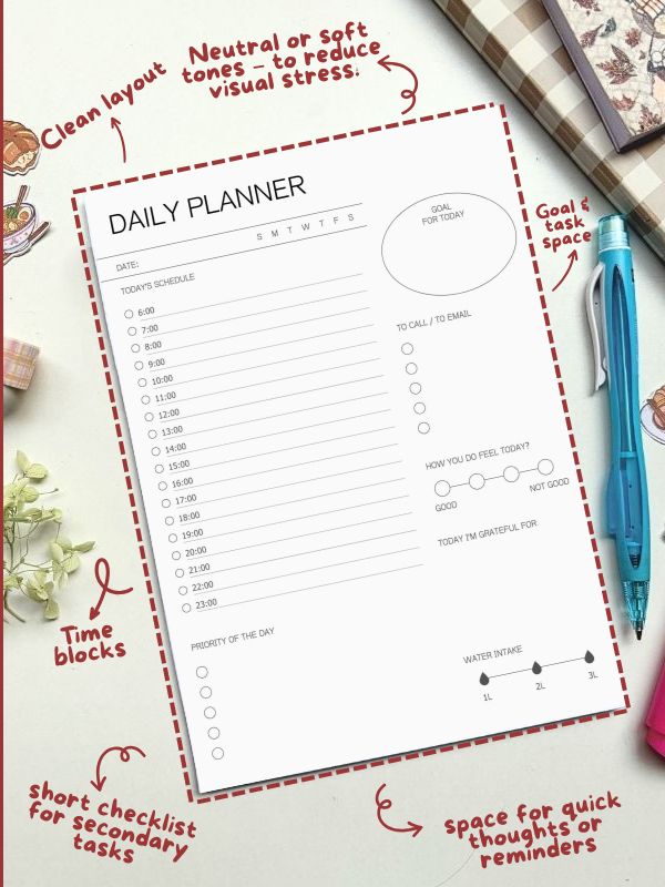 Daily planning allows you to prioritize tasks, set clear goals, track progress, and break larger projects into manageable steps. Instead of juggling everything in your head, writing your plans down helps reduce stress, sharpen focus, and boost productivity—whether you’re working, studying, building habits, or running a business.
