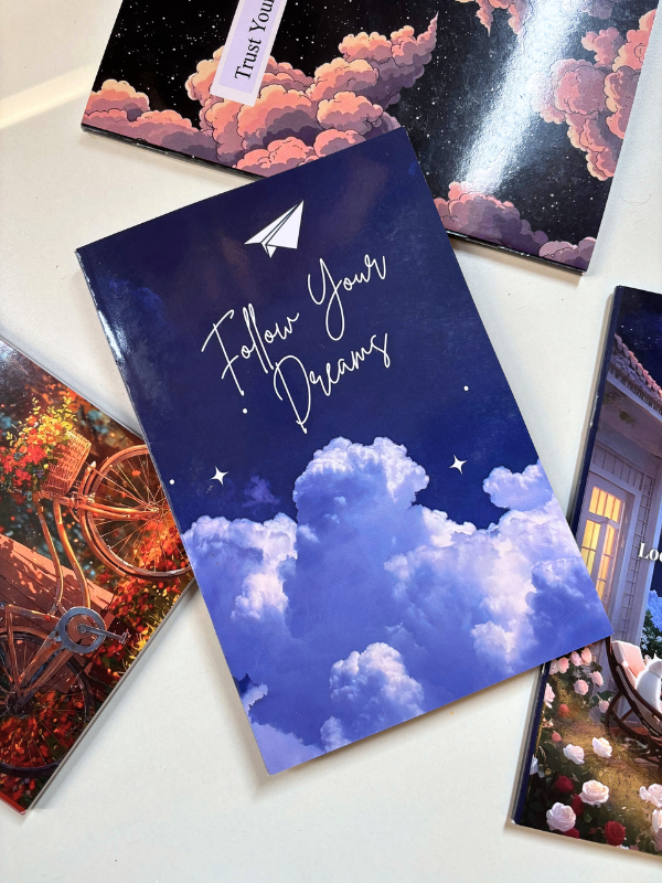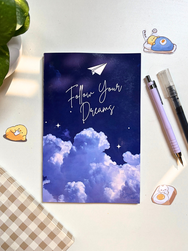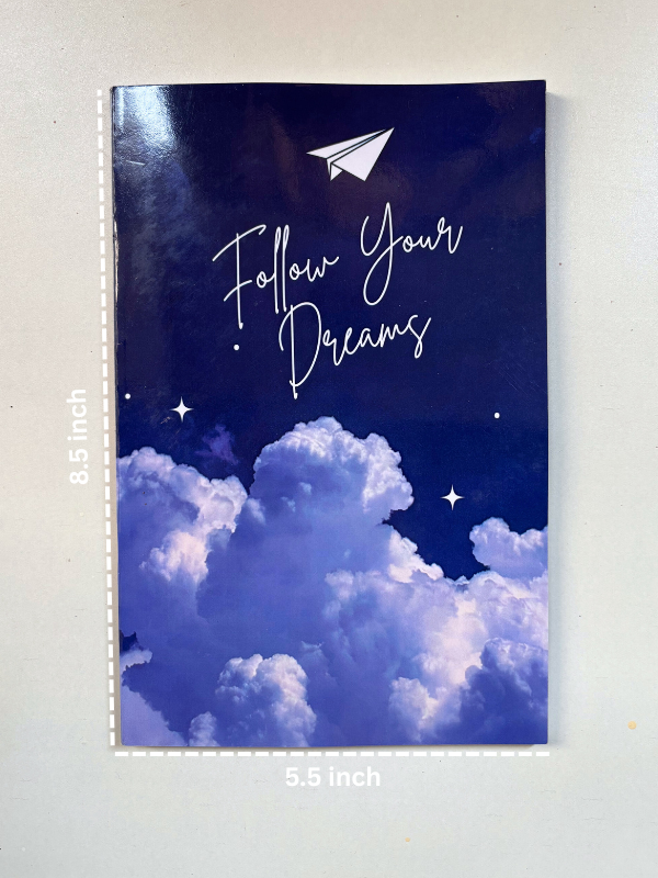 Let your ideas float as freely as the clouds. This aesthetic notebook features a soothing sky design with the message “Follow Your Dreams” — a gentle reminder to stay inspired every single day.