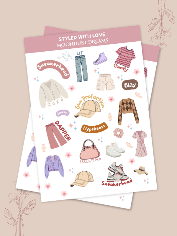 The Styled With Love sticker pack is a collection of cute fashion-themed illustrations inspired by everyday outfits and personal style. The designs feature clothing, accessories, and styling details that add a playful and creative touch to journals and planners.