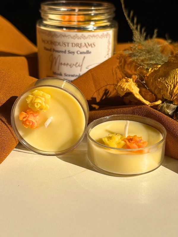 The Moonveil tealight candle set includes a pair of small, musk-scented candles designed to add a gentle fragrance and decorative touch to your space. Each tealight is hand-poured and finished with two small floral decorations on top, giving the set a soft, charming look.