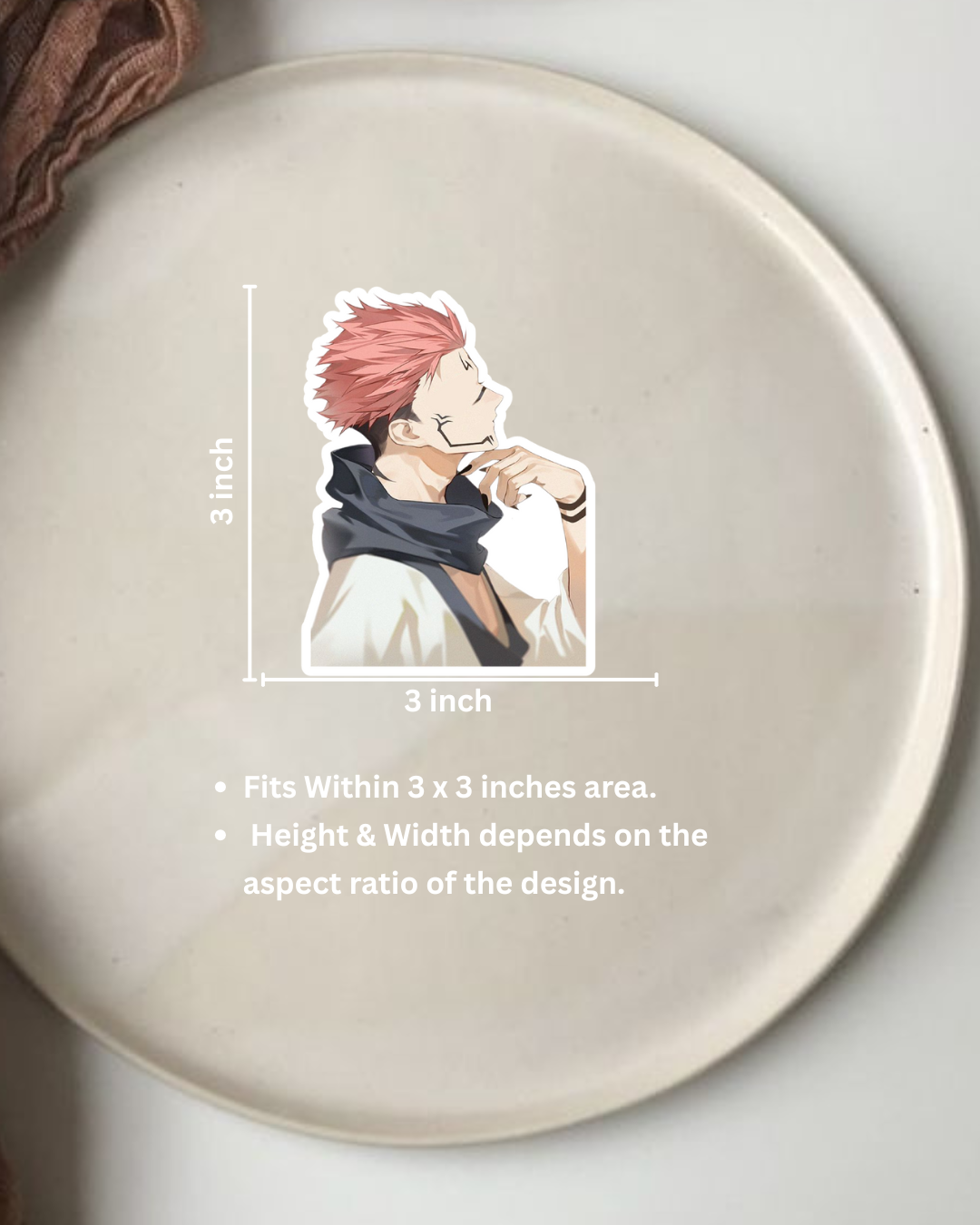 The Sukuna vinyl sticker is inspired by Jujutsu Kaisen and reflects the dark, commanding presence of the character. The design focuses on Sukuna’s intense and unmistakable aura, making it a striking addition to anime-themed stationery and collectibles.