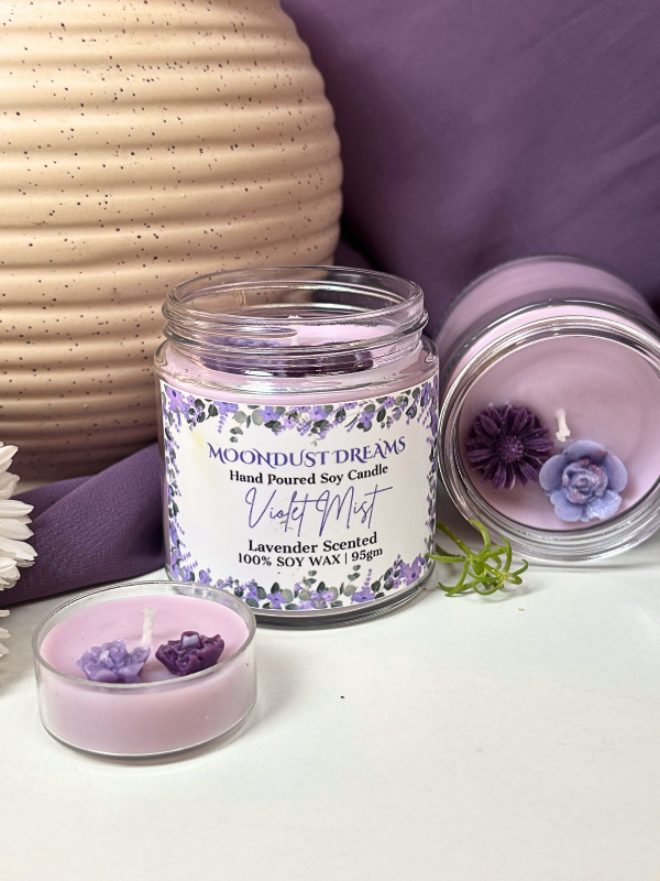 The Violet Mist scented candle features a soft lavender fragrance, known for its calming and soothing qualities. The scent is gentle, floral, and clean, making it well suited for everyday relaxation and quiet spaces.